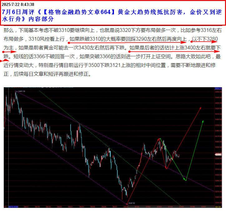 昨日黄金开盘3396.77美元,最高3433.46美元,最低3383.10美元,收盘3431.20美元,报收中阳线。7月6日周评《【格物金融趋势文章664】黄金大趋势线抵抗厉害,金价又到逆水行舟》,我们提及黄金弱势绿色路径就是以不下3280为主上行,然后有望冲击3400之后下跌。这个过程比较纷扰,黄金最终实际走势是3282.50上涨,过程中3377附近产生了两次跳水,一次从3375下跌到3321,一次从3377下跌到3309.50美元,走势很纷扰,但是,最终黄金经过两周的反复折腾之后还是奔向了3400美元。
