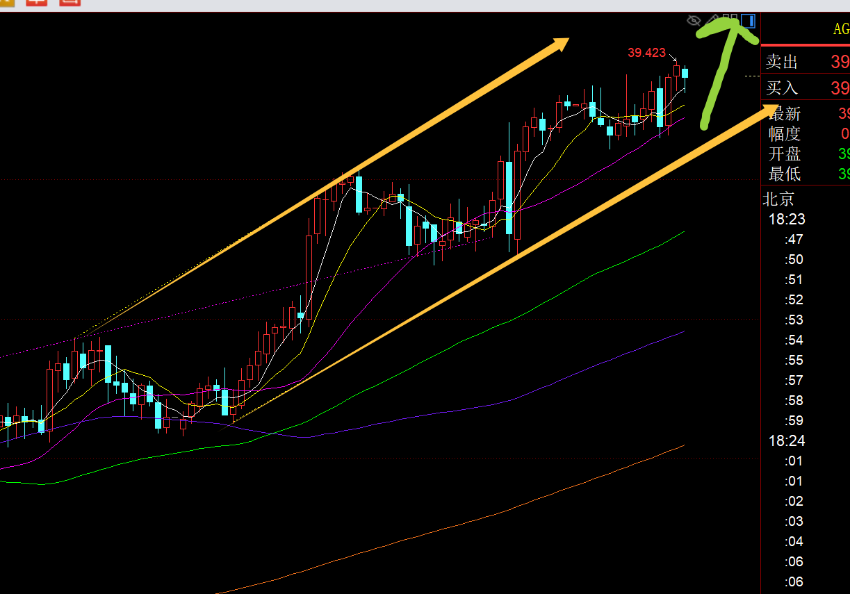 第二,白银方面:同样,本周一大阳拉升,突破站上短期通道上轨,回踩确认支撑点在38.7一线,日内也是精准卡在最低点,成功拉升,最高目前逼近39.4一线;