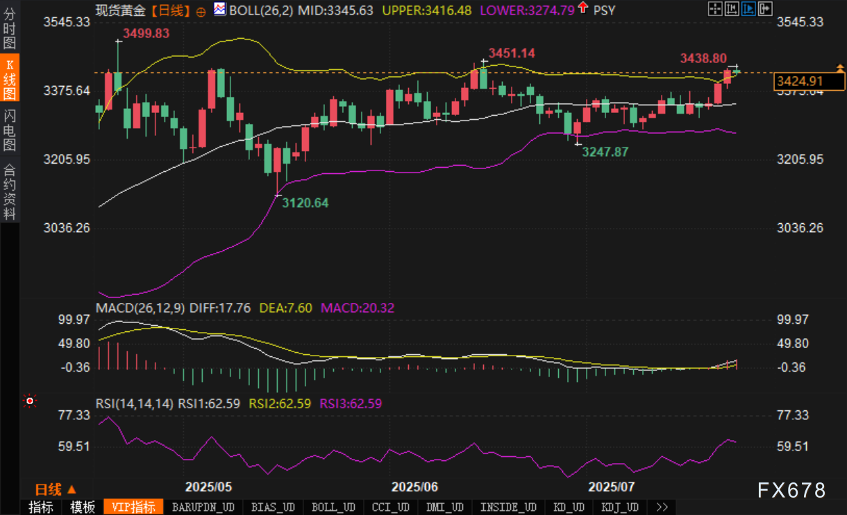 从日线图观察,黄金价格自7月初以来持续沿布林带中轨震荡,目前价格已运行于布林带上轨附近,且连续两个交易日实体阳线显著放量,显示短线多头仍具一定主导权。当前布林带三轨走平偏上扬,反映市场波动率正逐步扩大,存在进一步拉升的空间。