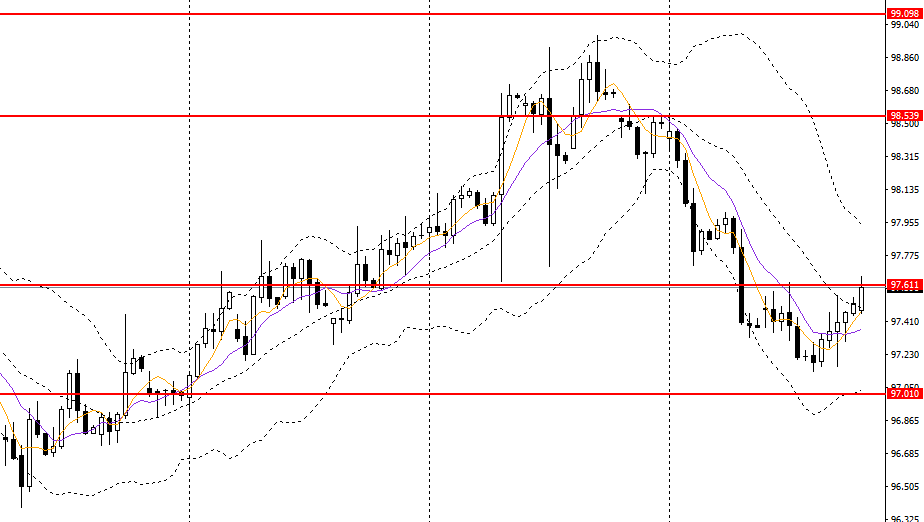 美元指数收复周三跌幅,日线RSI拐头上行,4小时上探关键压力97.6,短线趋势重新转多,如彻底升破,短线有望挑战98。