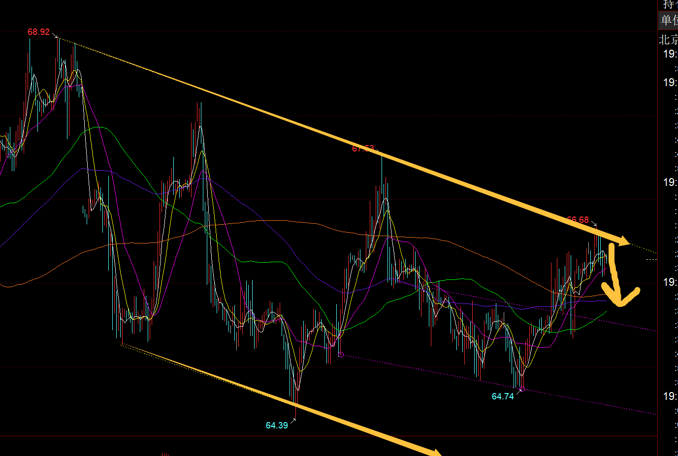 原油方面:当前黄色通道上轨有所承压,今晚66.6之下看压制,下方支撑65.5-65.3看得失,若失守,则进一步下探; 反之,若突破新高站上66.6,则打破通道,会延续反弹上攻;