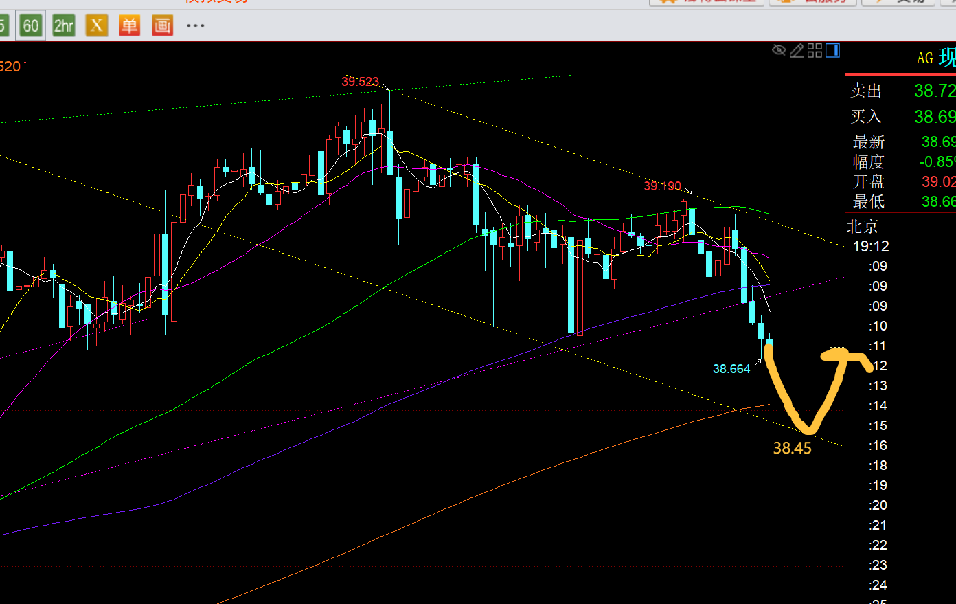 第二,白银方面:研报指出38.7短期通道下轨支撑触及继续看涨,美盘刚好打到,就立马稳定拉升,最高拉升39.1,也有一定利润空间,比黄金给了些;