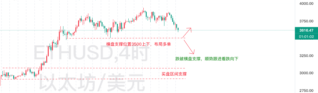 第二:4小时,暂时是高位震荡,暂时还没完全跌破横盘支撑位置;横盘的支撑位置在3490-3510的区间,可以布局多单;