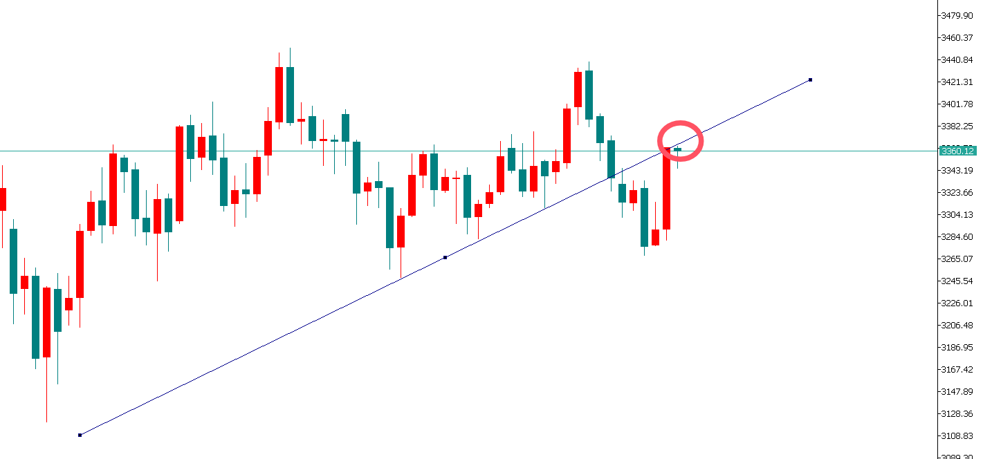 从黄金日线图来看,当前位置正好触及此前上升趋势线形成的反压力位。另外,当前4小时图出现看跌吞没形态,早盘高点3366恐怕都不一定能过去!!!