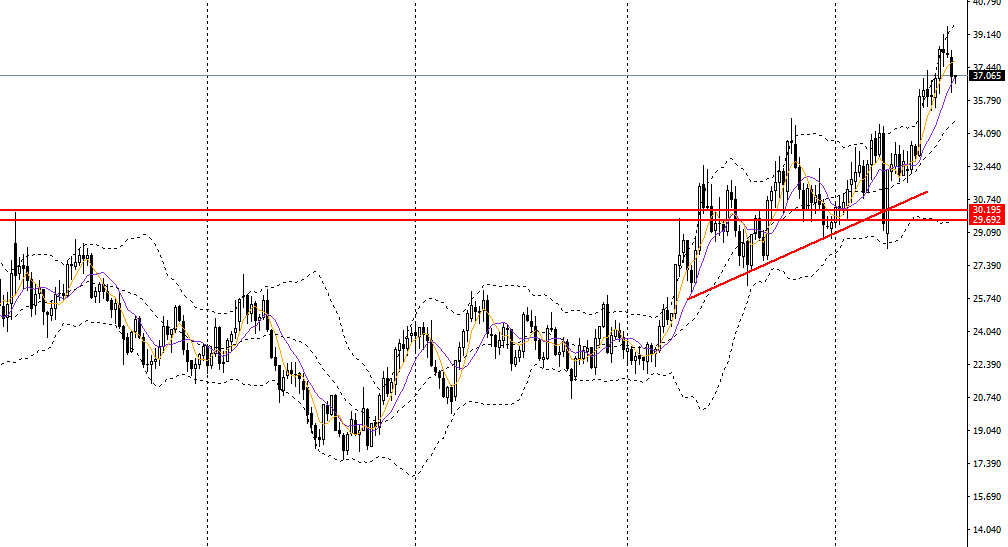 白银上周收长阴线,回踩10周均线,RSI小幅回落,波段整体走势仍强劲。周五止跌反弹,仍承压于5日均线,日线RSI位于50下方,4小时升破36.80一线阻力,如回踩36.80附近企稳可进多,如站上37,后市预计将上探37.30。