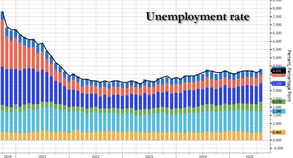 美国7月非农就业新增人数降至7.3万,创9个月新低,失业率回升至4.2%。