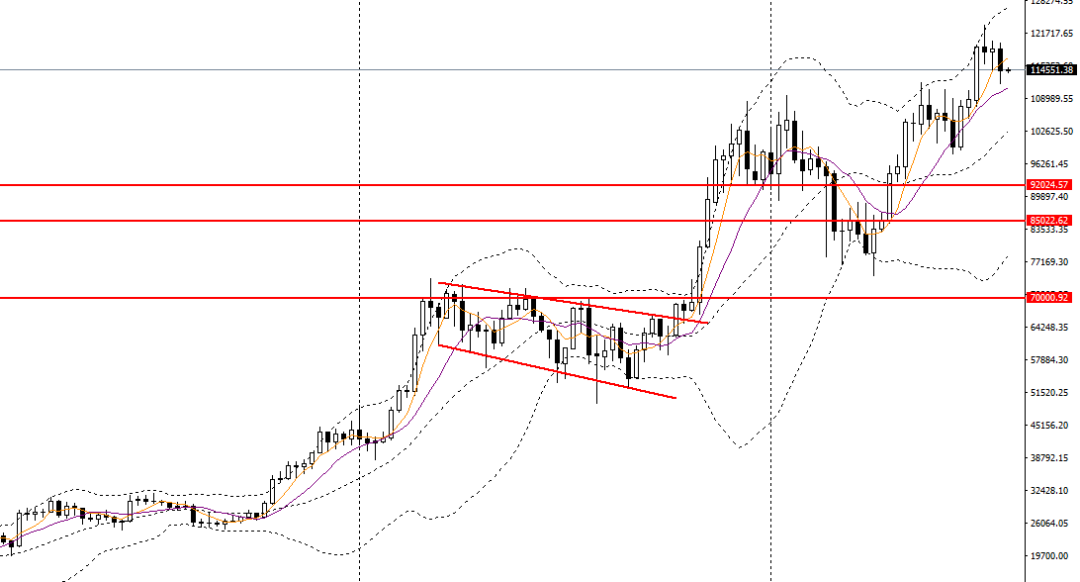 比特币上周自高位回落,徘徊于5周均线附近,波段整体走势仍强劲。周五止跌回升,升破5日均线,日线RSI位于50附近,4小时呈头肩底,短线有望重新上探116000一线阻力。