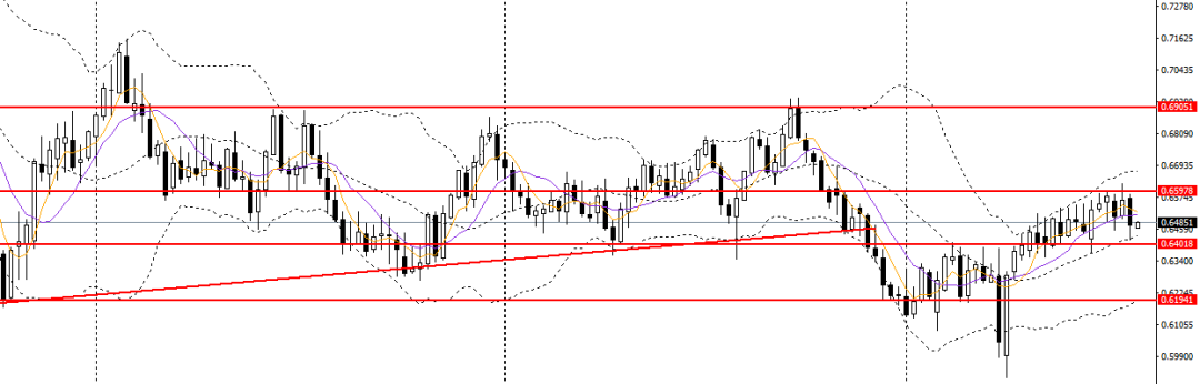 澳美上周收看跌吞没阴柱,失守10周均线,波段仍趋于震荡。周五拐头上行,徘徊于5日均线附近,4小时最终守住0.64关口,短线多单可继续持有,后市可看多至0.65-0.6520。