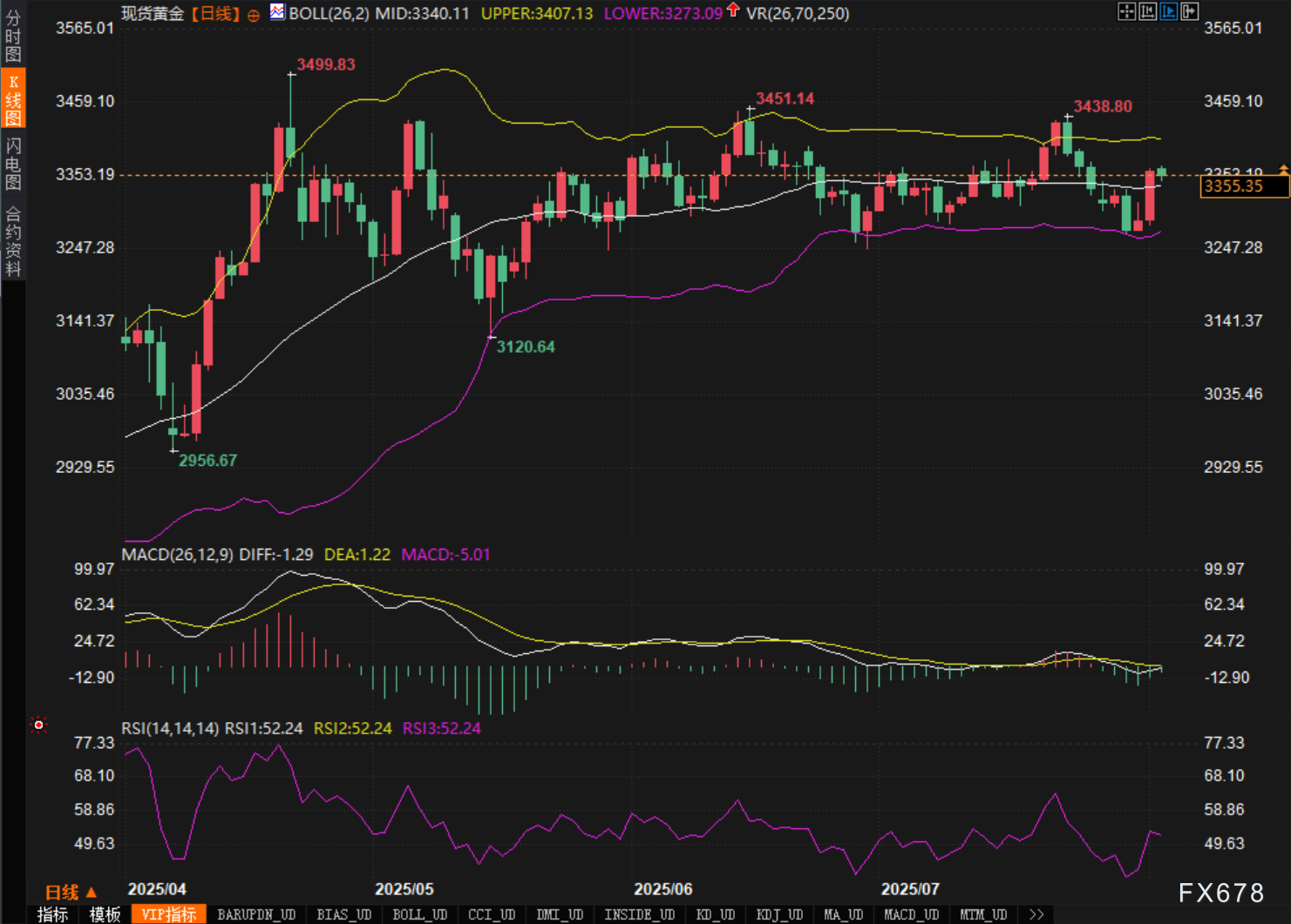 从日线图观察,黄金经历长时间横盘后,终于出现关键反弹信号。上周最低下探至3270美元下方,短暂接触布林下轨后迅速回升,形成“假跌破”信号,且当前价格站稳中轨(3340.11)之上,为多头恢复带来信心。