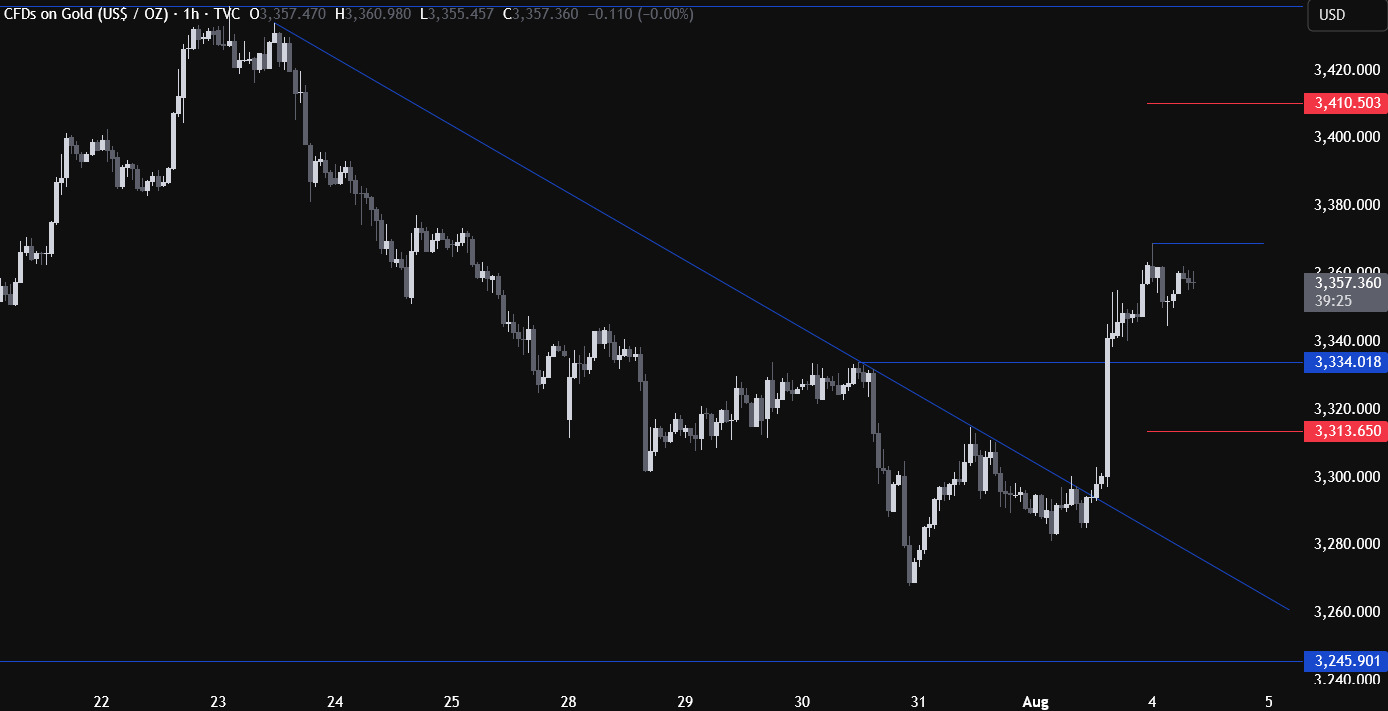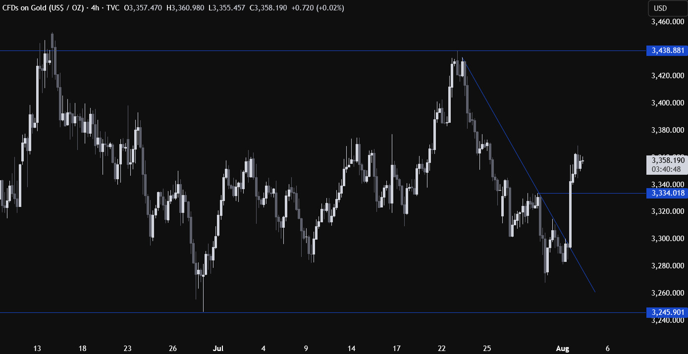 从4小时图来看,此前黄金处于一个下降趋势线下方,代表空头主导格局。而在NFP数据公布后,价格强势突破该趋势线,买方大举进场,推动价格上扬。当前价格已经站上前高3,334美元,预计该位置将成为新一轮支撑点。多头可能会在此位置附近尝试加仓,止损设于其下方,目标仍是3,438美元阻力位。空头方面,则会等待价格跌破3,334美元,并寻求进一步下探至3,245美元支撑的机会。
