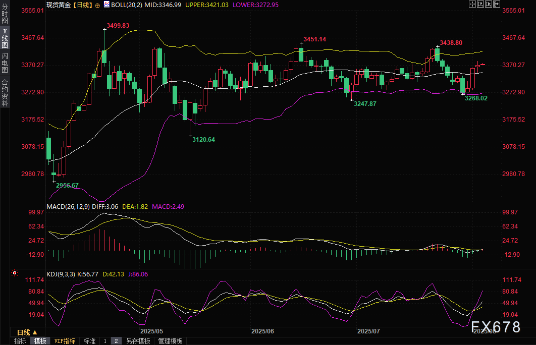 汇通财经APP讯——受美国经济数据疲软、美联储降息预期升温以及全球贸易紧张局势加剧的影响,周一(8月4日)现货黄金延续上周五涨势,盘中最高触及3385.26美元/盎司,收报3373.38美元/盎司,创下7月24日以来的最高水平,涨幅约0.3%,为连续三个交易日上涨。周二(8月5日)亚市早盘,现货黄金高位震荡,目前交投于3378.16美元/盎司附近。