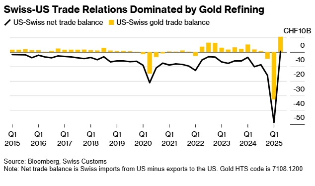 瑞士海关数据显示,今年第一季度,瑞士对美贸易顺差的三分之二以上来自创纪录的逾360亿美元的黄金出口。
