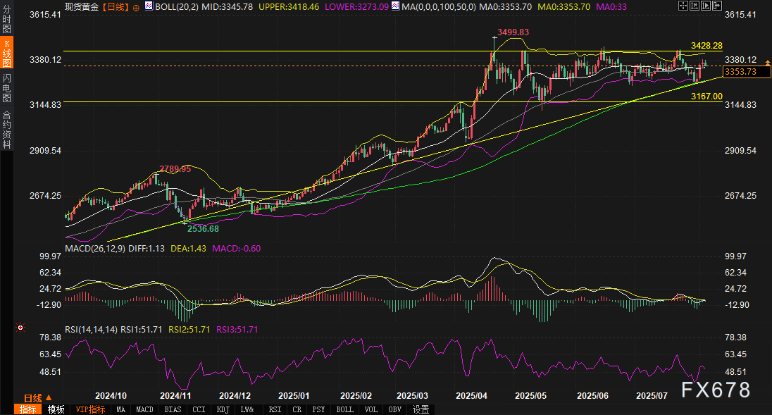 从技术面看,黄金价格在触及两周高点后陷入盘整,日线图显示当前报价3351.31美元/盎司,略高于50日均线3344.20美元/盎司,距离100日均线3278.19美元/盎司仍有一定空间。上周金价跌破上升三角形态,并短暂触及一个月低点,但迅速在100日均线附近获得支撑,显示空头动能不足,市场多空力量仍处于胶着状态。