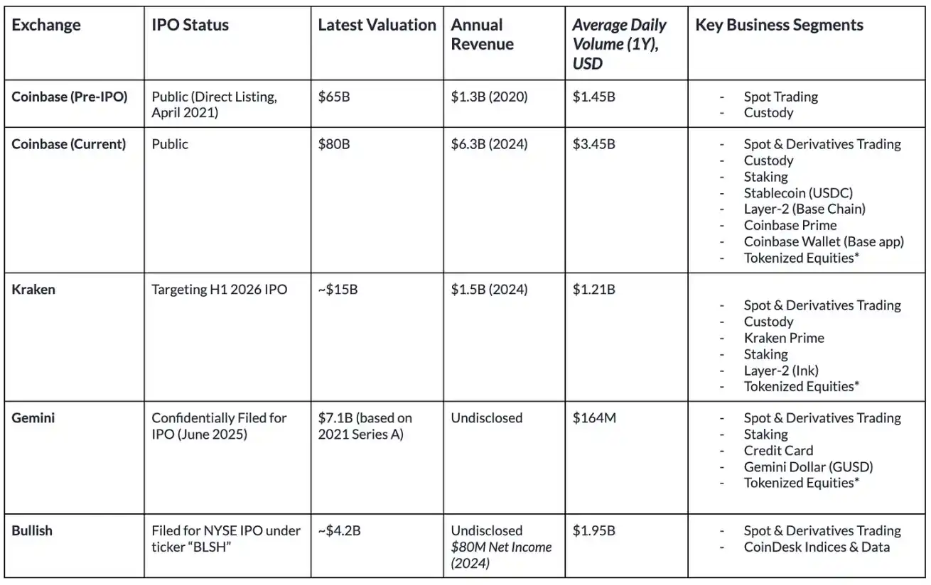 · 2021 年 Coinbase 的 IPO 树立了行业标杆。Coinbase 上市时的估值为 650 亿美元,当时其 96% 的收入来自交易手续费,而如今订阅和服务收入在 2025 年第二季度已占 44%。