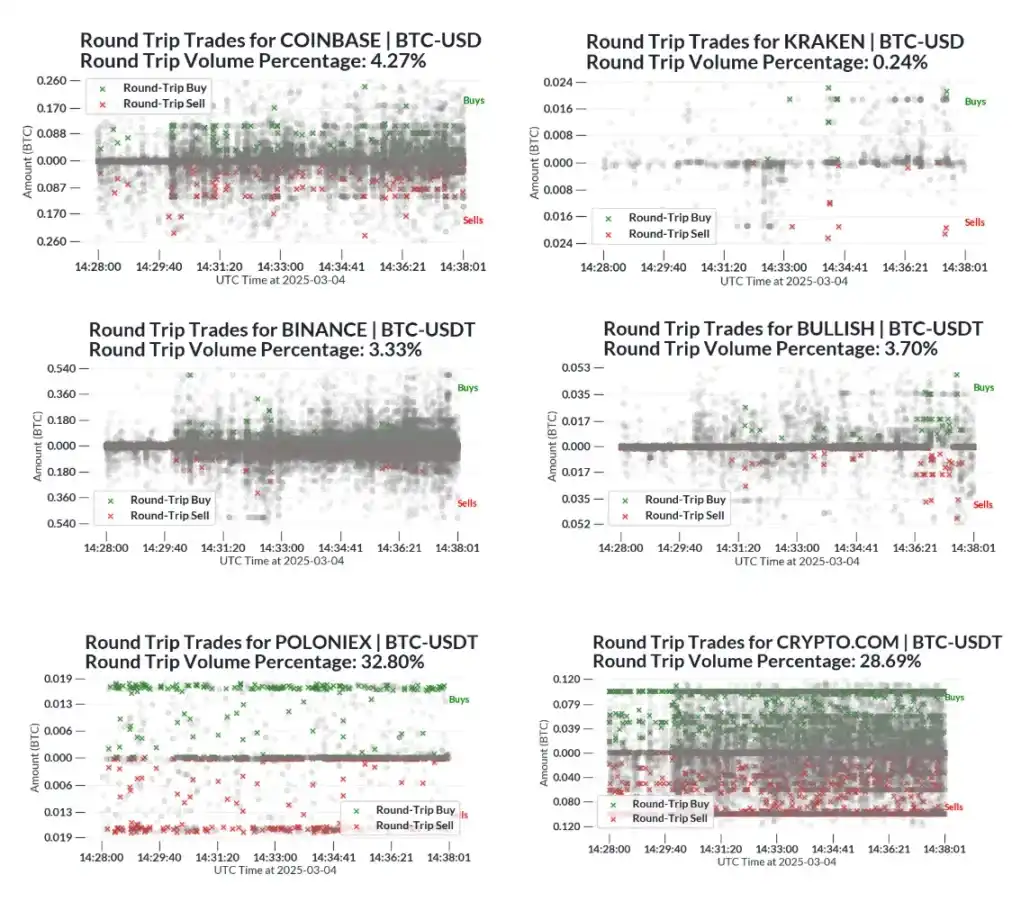 由于该方法的近似性,我们预计会出现一些误报,即由正常市场活动(例如做市商通过在订单簿两侧提供流动性来促进交易)导致的重复交易。然而与 Crypto.com 和 Poloniex 等行业基线相比,重复交易比例较高,引发了对其报告交易量数据可靠性的担忧。