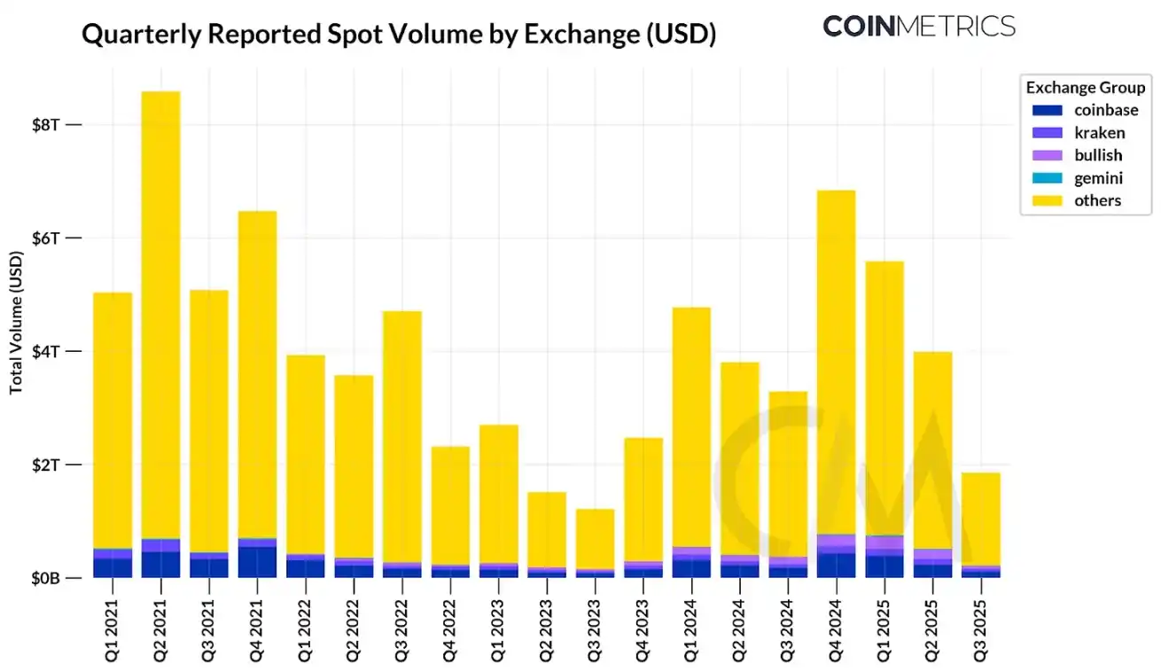 · 在 IPO 候选交易平台中,Coinbase 仍以 49% 的现货交易量领先。Bullish 和 Kraken 各占 22%,并迅速扩展新服务。