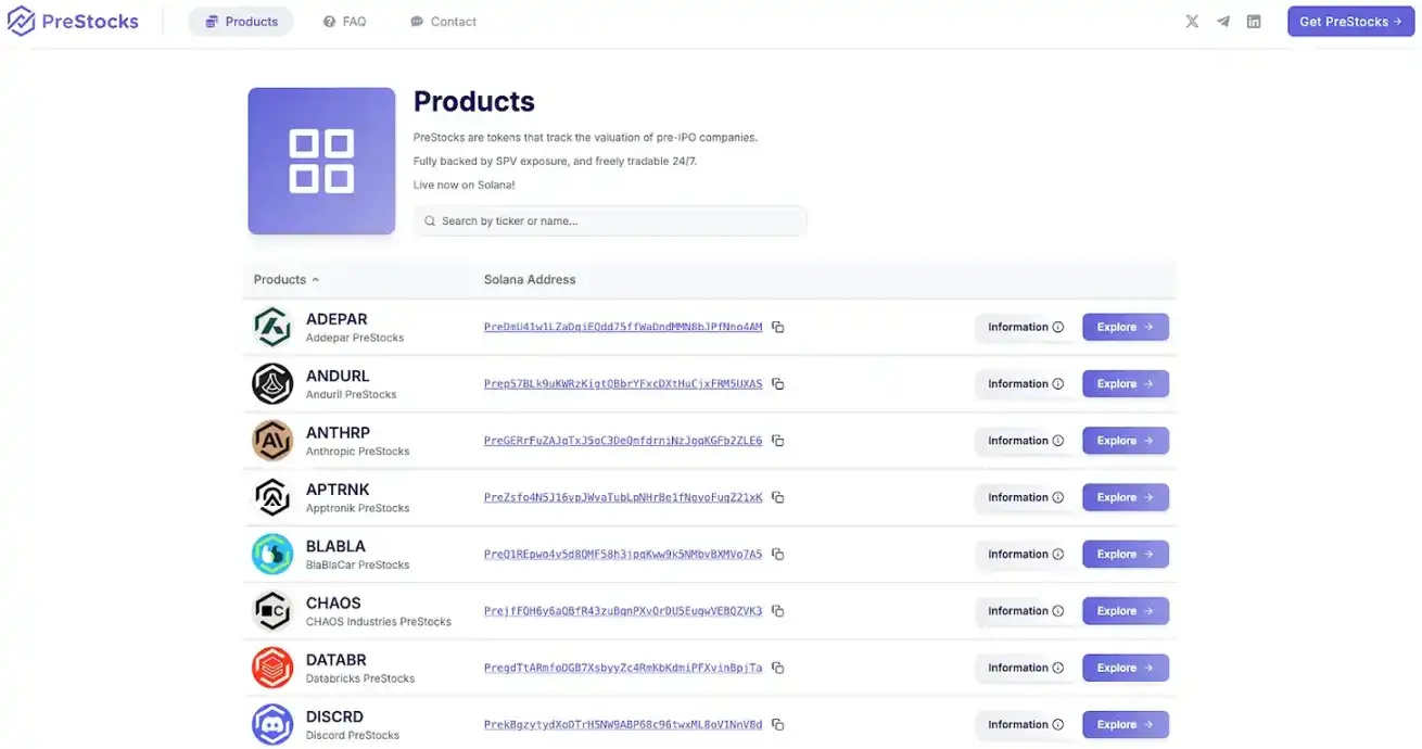 PreStocks 采用与 Jarsy 类似的模型,购买私募公司股票并按 1:1 比例发行背书的代币。该平台目前支持 22 种 Pre-IPO 股票的交易,并已向公众开放产品。