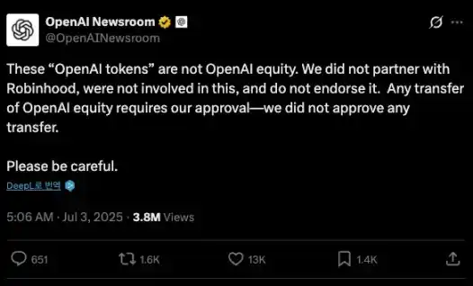 其次,私募公司的抵制仍是关键障碍。2025 年 6 月,Robinhood 宣布为欧盟客户推出一项新服务,提供对 OpenAI 和 SpaceX 等公司的代币化投资敞口。OpenAI 立即公开反对,声明称:「这些代币不代表 OpenAI 的股权,我们与 Robinhood 没有合作关系。」这一回应凸显了私募公司不愿放弃对股权结构和投资者管理的控制权,这是它们严密守护的核心功能。