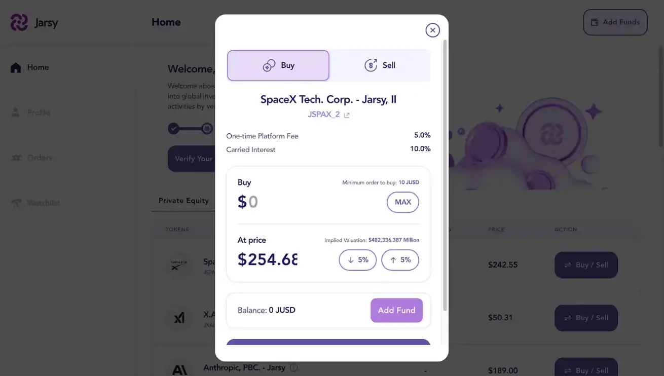Jarsy 采用 1:1 资产背书的代币化模型。其核心机制是直接收购 Pre-IPO 股票,并为每持有一股发行一枚代币。例如,如果 Jarsy 持有 1000 股 SpaceX 股票,它将铸造 1000 枚 JSPAX 代币。尽管投资者不直接持有标的股票,但他们享有所有相关的经济权利,包括股息和股价增值。
