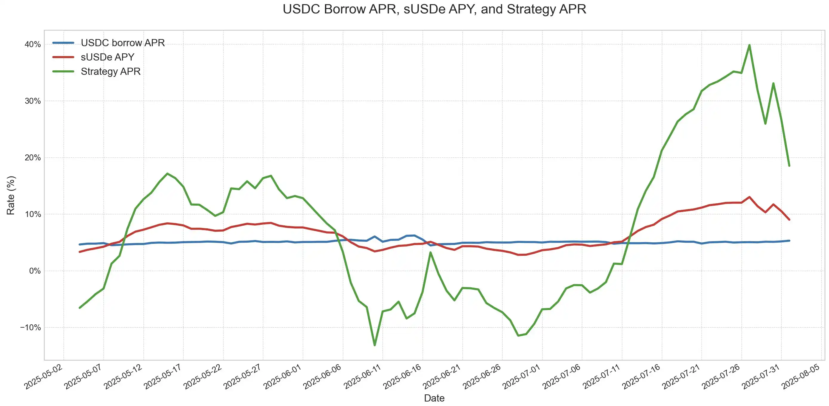 为了提升资本效率,用户通过资金市场进行杠杆轮动,即反复借贷与质押以放大收益。策略操作示例为:存入 sUSDe,按 93% 抵押率借出 USDC,随后将 USDC 兑换回 sUSDe,循环操作,实现约 10 倍杠杆。只要 USDe 年化收益超过 USDC 借贷成本,策略便持续盈利。