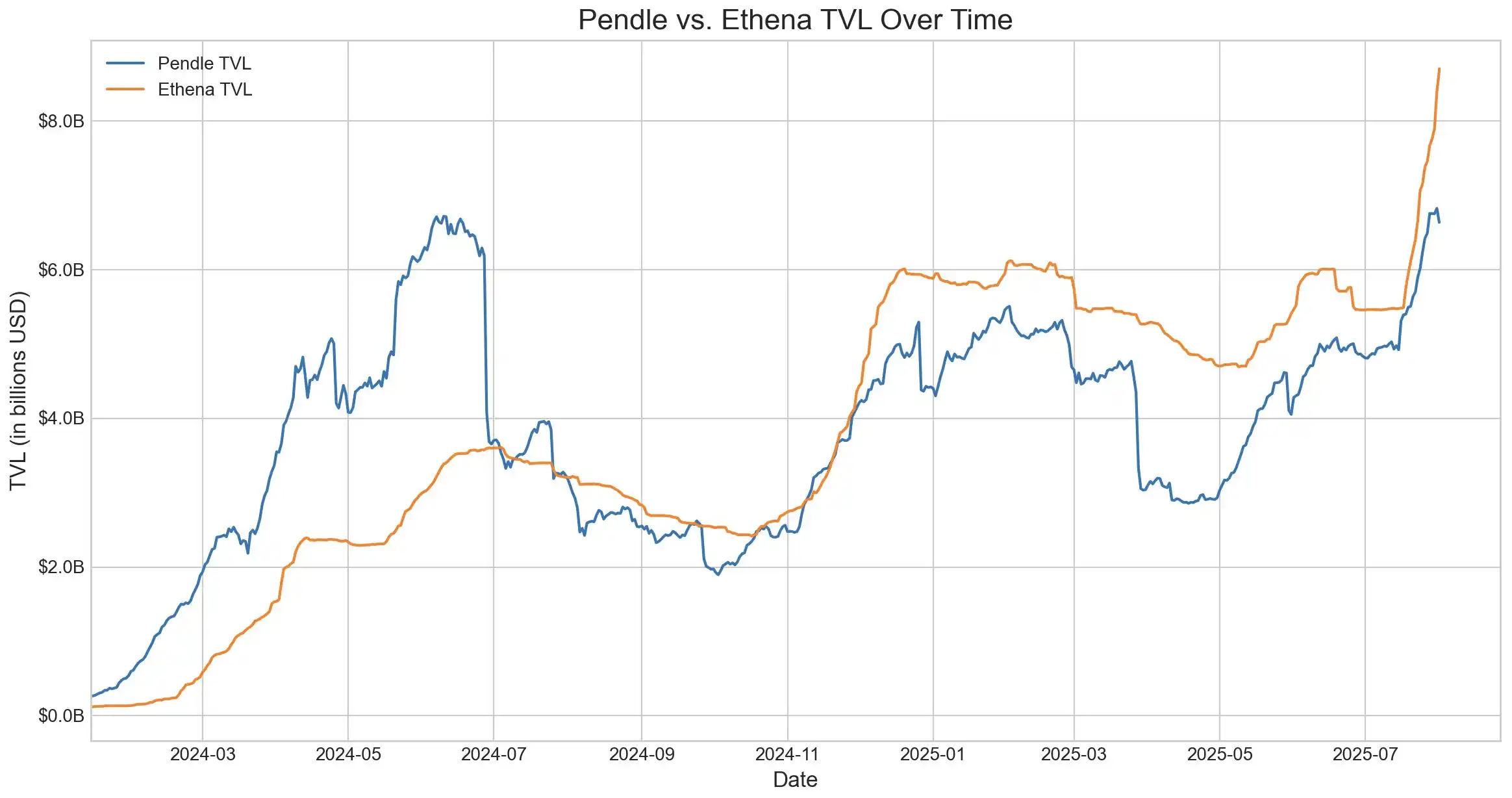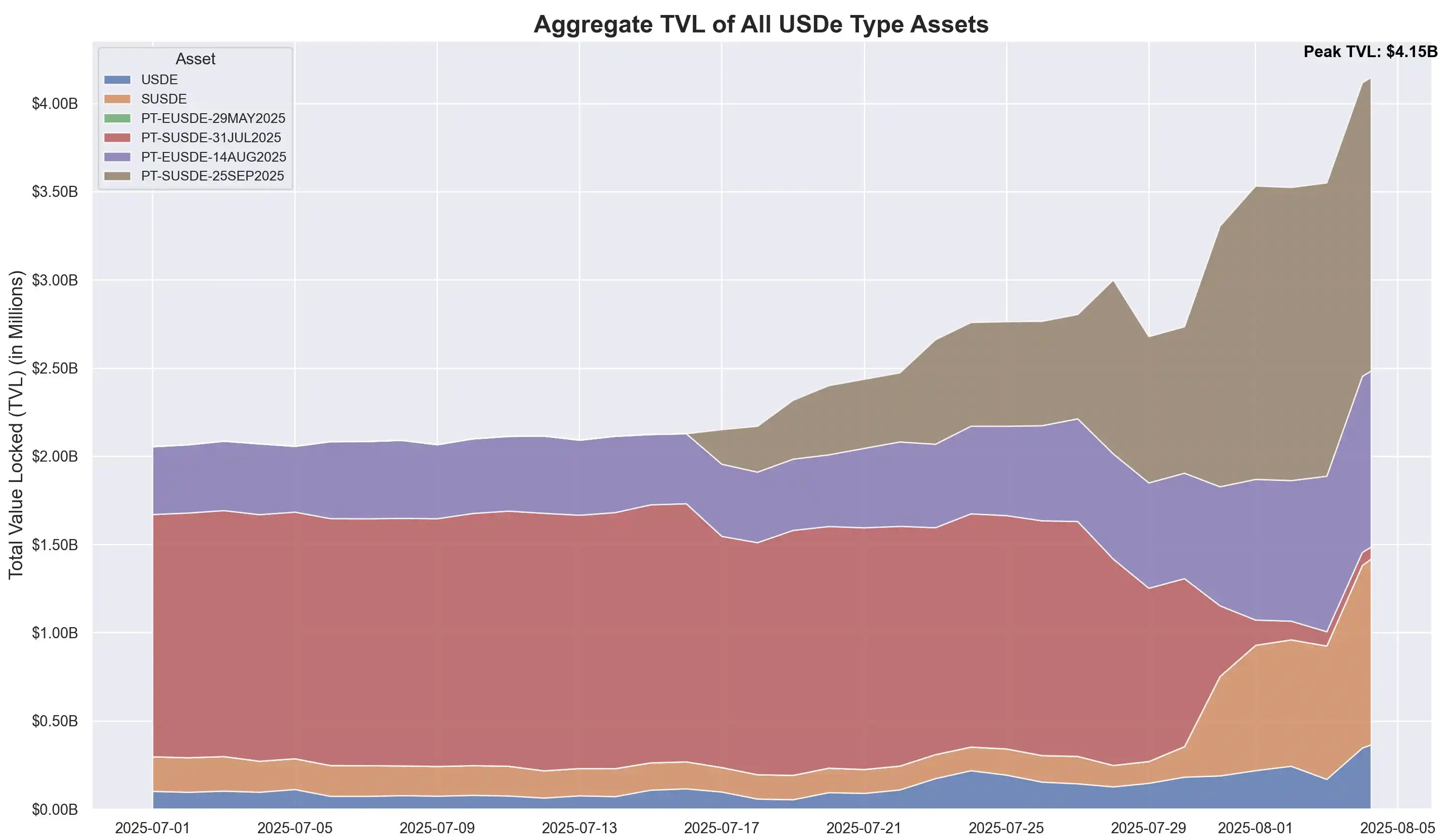 Shaunda Devens 于 2025 年 8 月 6 日发布的推文指出,Ethena 的 USDe 供应在 20 天内增长了 37 亿美元,主要由基于 Pendle 和 Aave 的 PT-USDe 轮动策略推动。目前约有 43 亿美元(占 USDe 总量 60%)锁定在 Pendle,另有 30 亿美元存入 Aave。