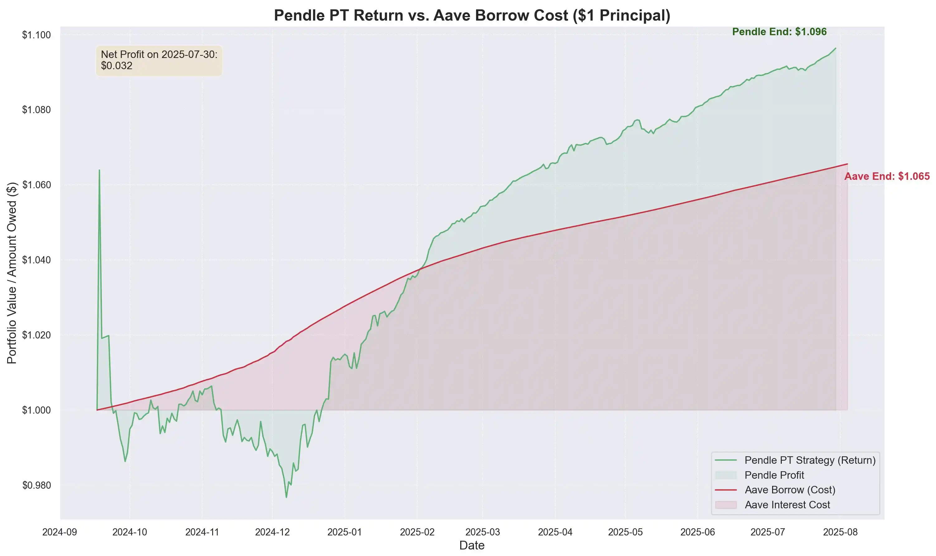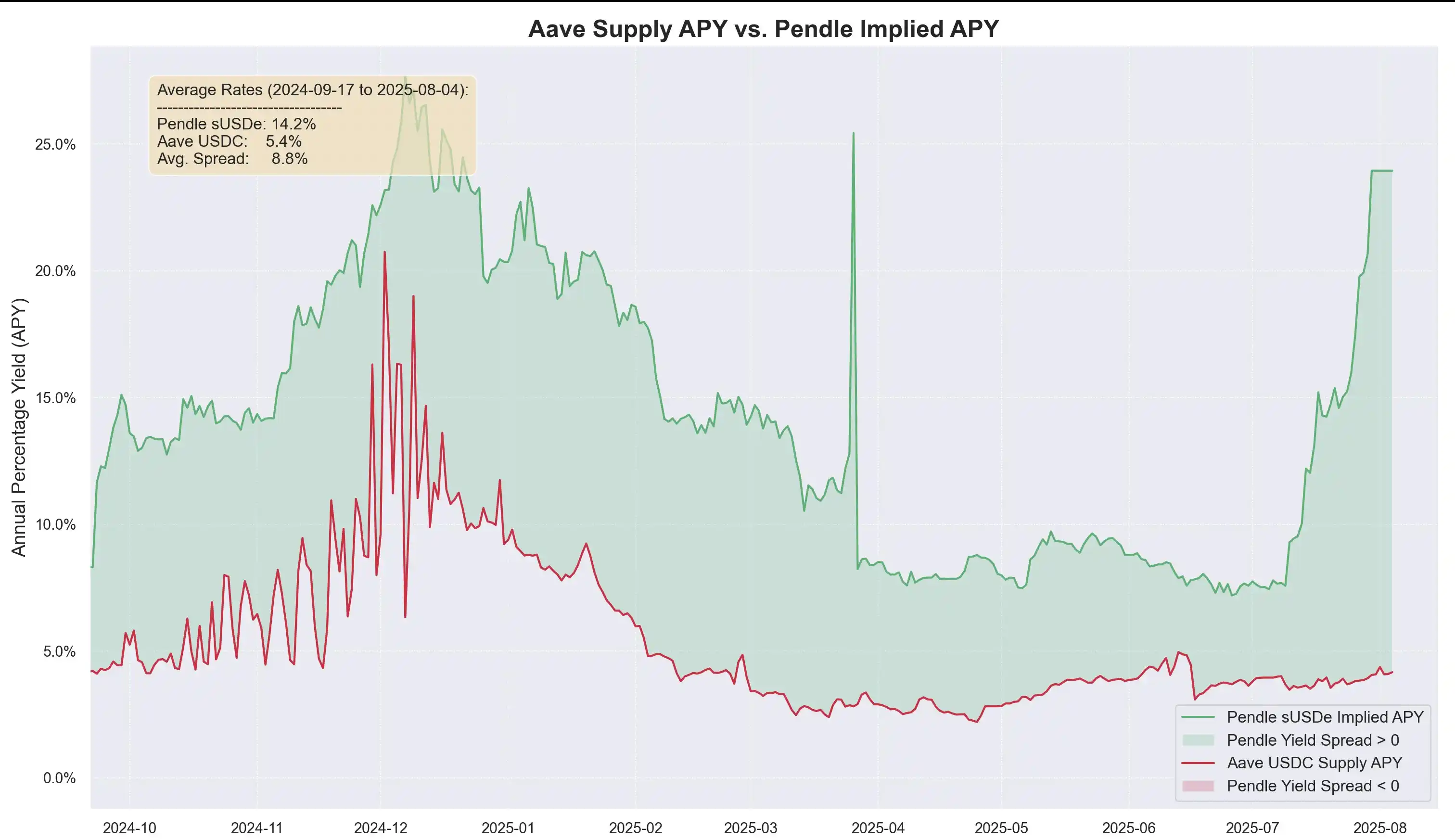 Devens 指出,Pendle 收益率长期高于借贷成本,未加杠杆利差平均约 8.8%。Aave 设计的 PT 预言机包含价格底线和紧急停止机制。一旦触发,贷款价值比(LTV)立即降至零,市场冻结,避免坏账产生。