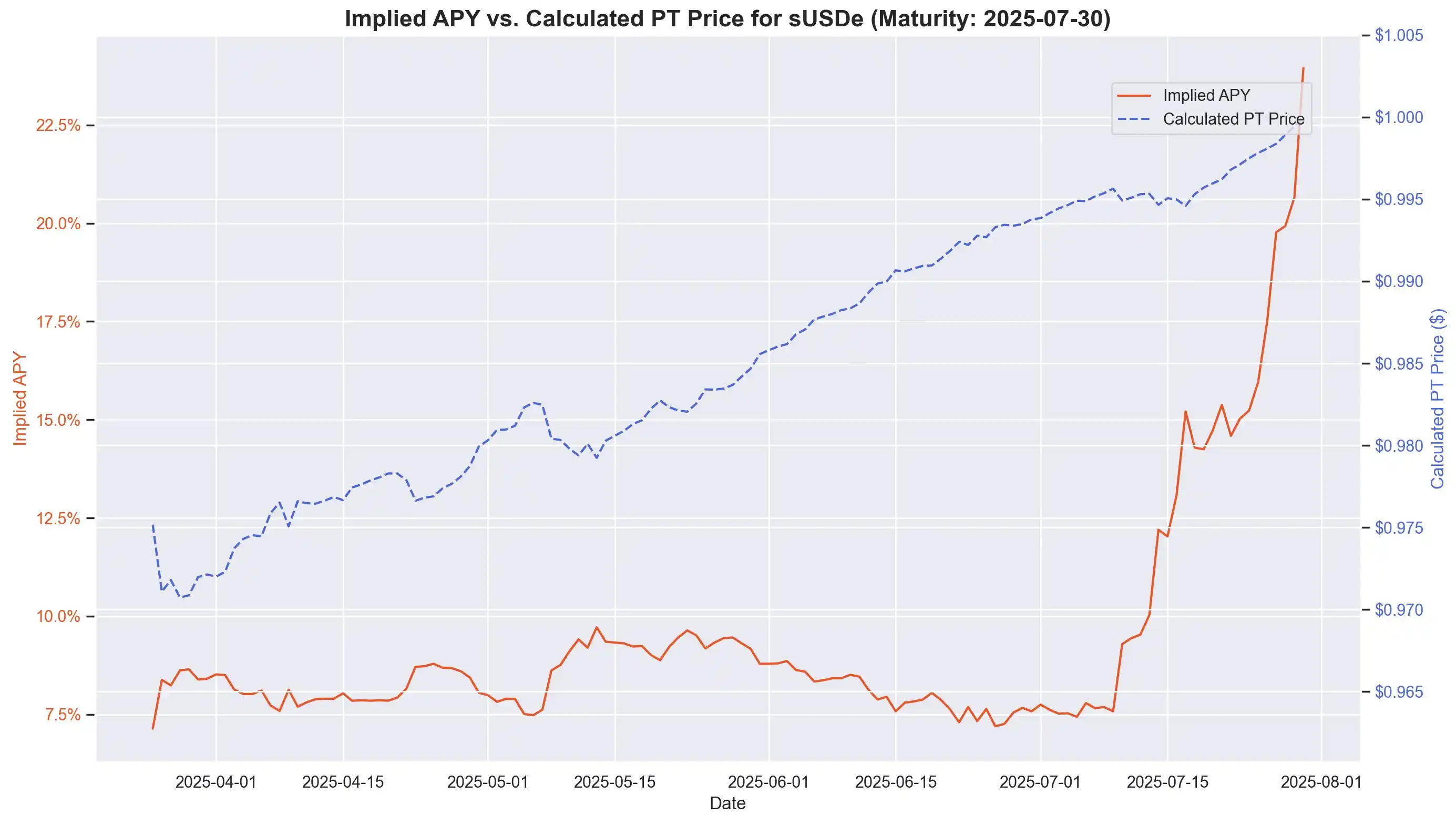 此波动性催生了对更可预测的收益产品的需求:Pendle 的 PT-loop 策略,Pendle 此前推出分离本金与收益的代币模型:本金代币(PT)和收益代币(YT)。PT 到期时可兑换 1 USDe,当前价格相较面值折价,类似零息债券,其价格折价与剩余期限推算出的隐含年化收益率为 YT 的年化收益率。