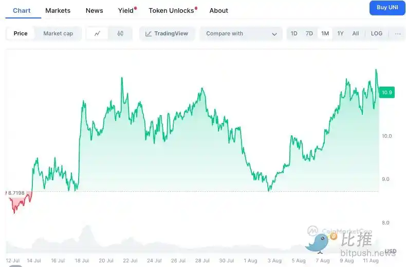 提案公布当日,UNI 短线上涨近 8% 后有所回落,市场显然对合规化与收入改革持积极预期。但从历史数据看,UNI 仍处于低位: