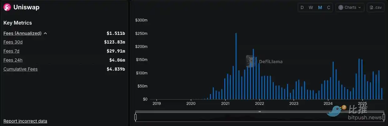 根据 DefiLlama 数据,过去一个月 Uniswap 用户支付的 Swap 费用超过 1.23 亿美元。即便只将其中 1/6 分流至 DAO,也意味着每月约 2,050 万美元的新增收入,年化超过 2.4 亿美元。这将大幅提升 UNI 的治理和资金支配能力。
