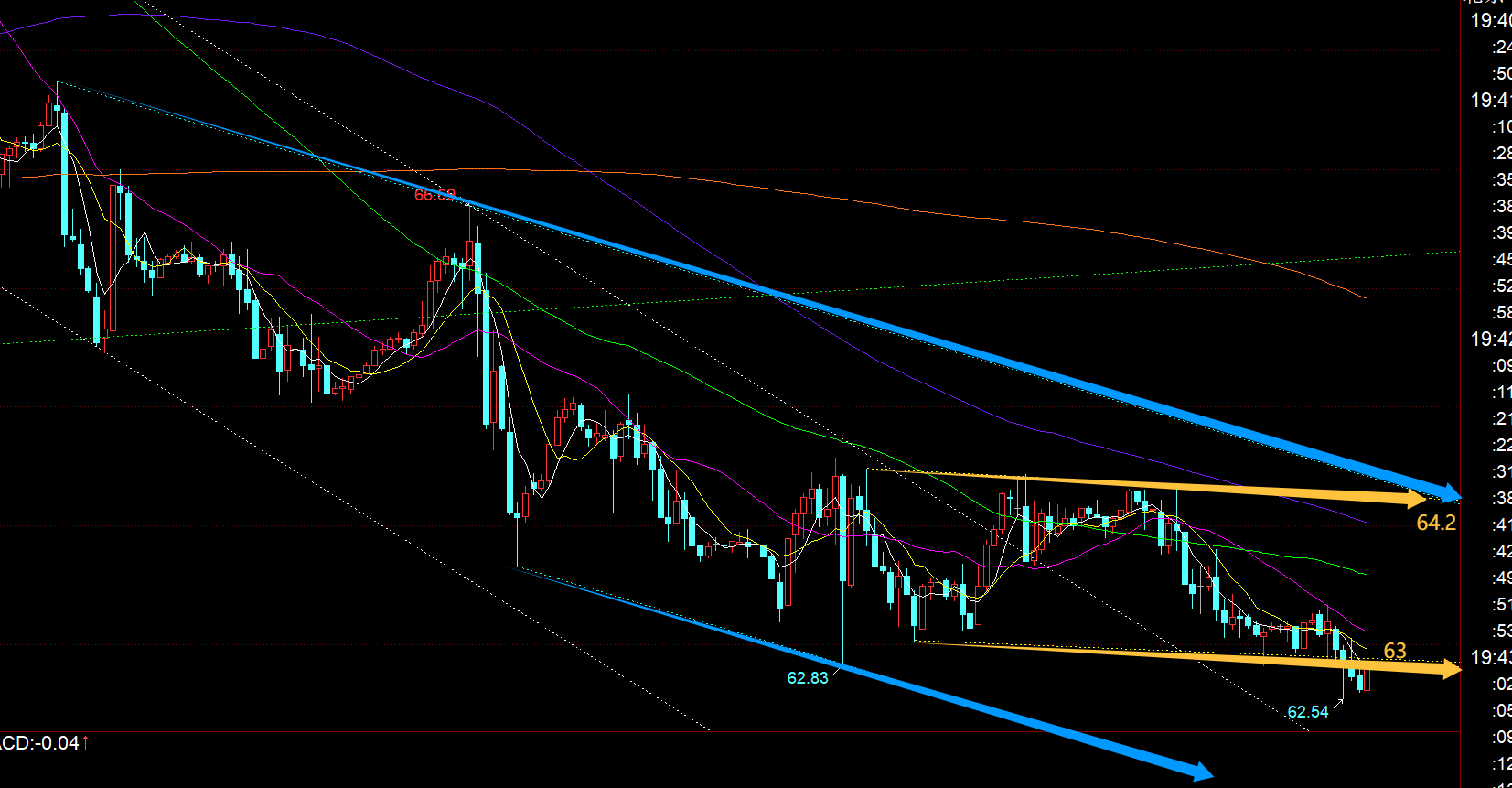 原油方面:从图中分布看,日内走势还是显得偏弱,黄色通道下轨支撑63有所下破,不过macd始终存在底背离状态,也不宜低位再看跌,容易出现超跌反弹;今晚留意63,若重新突破站上,则上方关注双通道反压点64.2一线;当然,日线级别中轨或66日均线阻力依然较大,拉高再去选择看跌震荡;