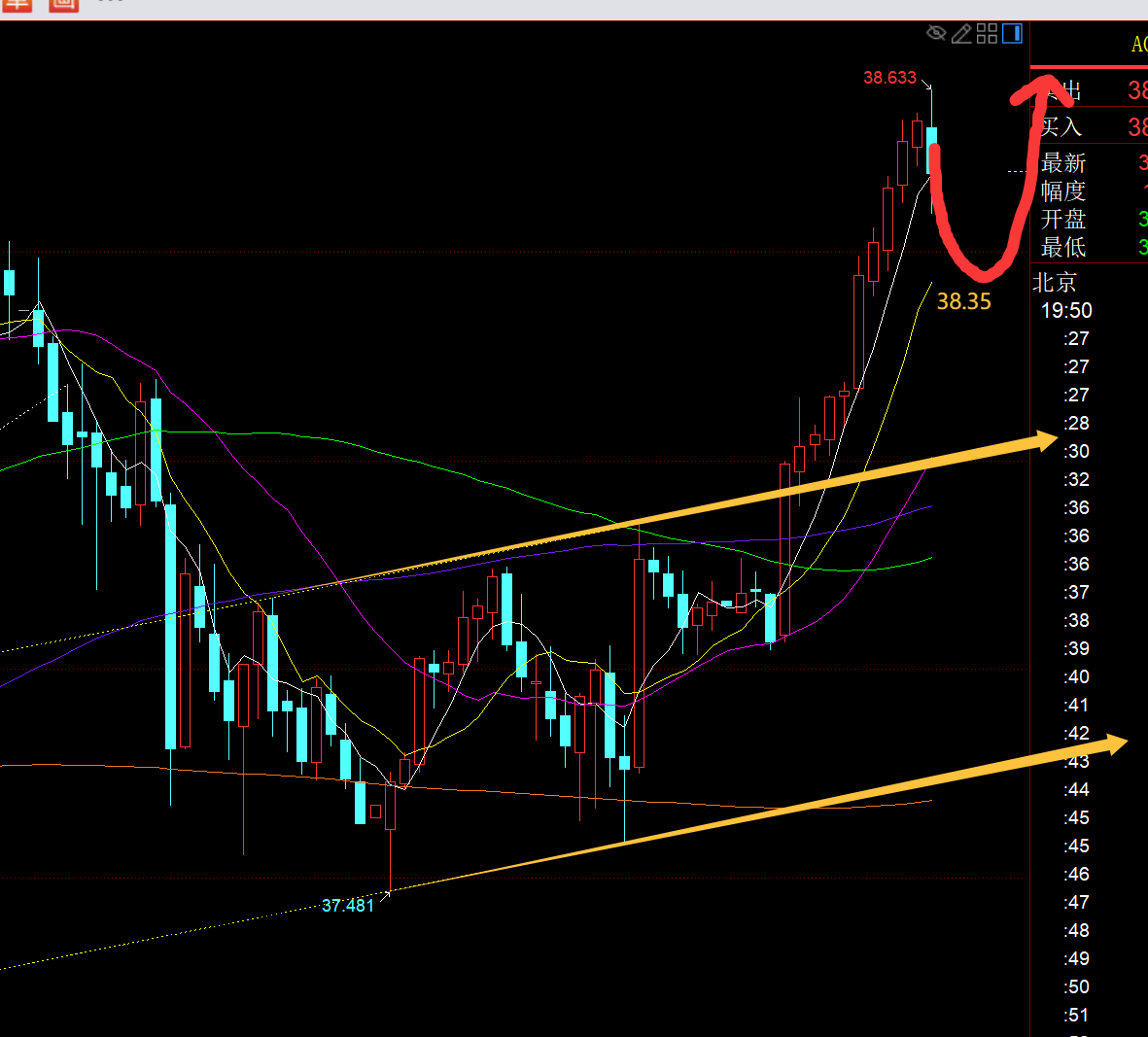 白银方面:今日它的走势比较靓丽,亚盘直接突破站上节点压力38关口,欧盘持续连阳小单边拉升走高,且冲破前面38.5阻力点;那么今晚自然更要二次去看涨,支撑不能选的太远,明显走势很强势,回落太低的话就容易震荡,不好二次走高;所以,关注小时线10均线38.35之上直接继续看涨,阻力目标38.8、39.2;