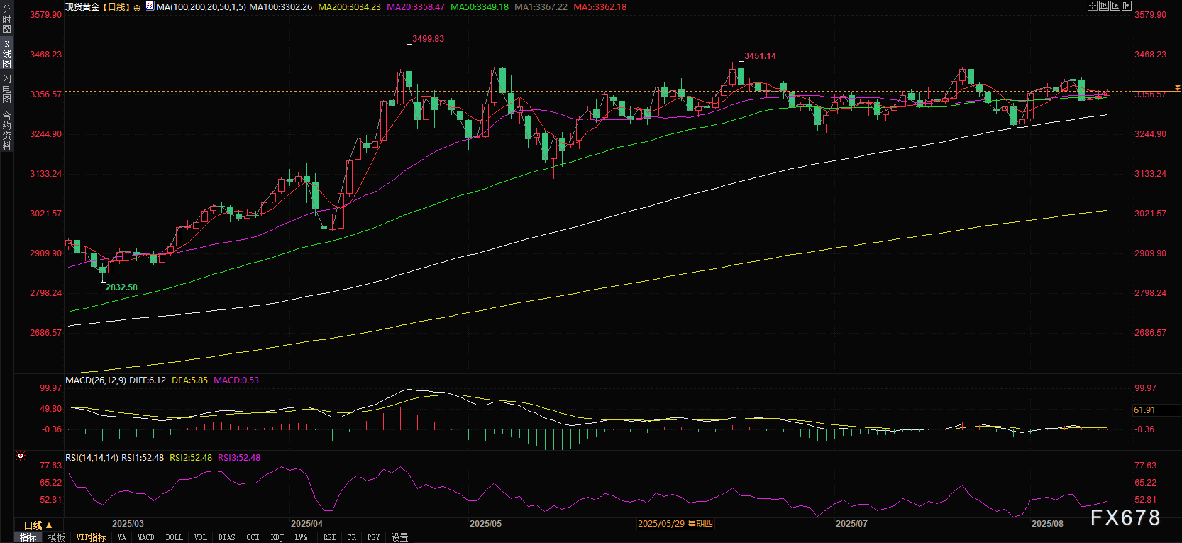 汇通财经APP讯——周四(8月14日)亚市,现货黄金震荡上涨,延续隔夜反弹走势,目前交投于3368.18美元/盎司附近,周三金价上涨0.3%,因投资者持续押注美联储将在9月政策会议上启动降息,目前市场还出现了一些9月份降息50个基点的预期。