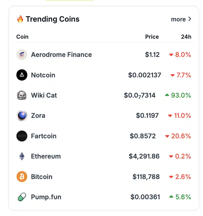 近期 AERO 展现了强劲涨势:8 月 9 日受 Coinbase 本地 DEX 功能上线消息刺激,AERO 连日上涨 一度触及 $1.23,7 日涨幅约 47%。目前市值约 $9.78 亿美元。为近期的热门项目币种。