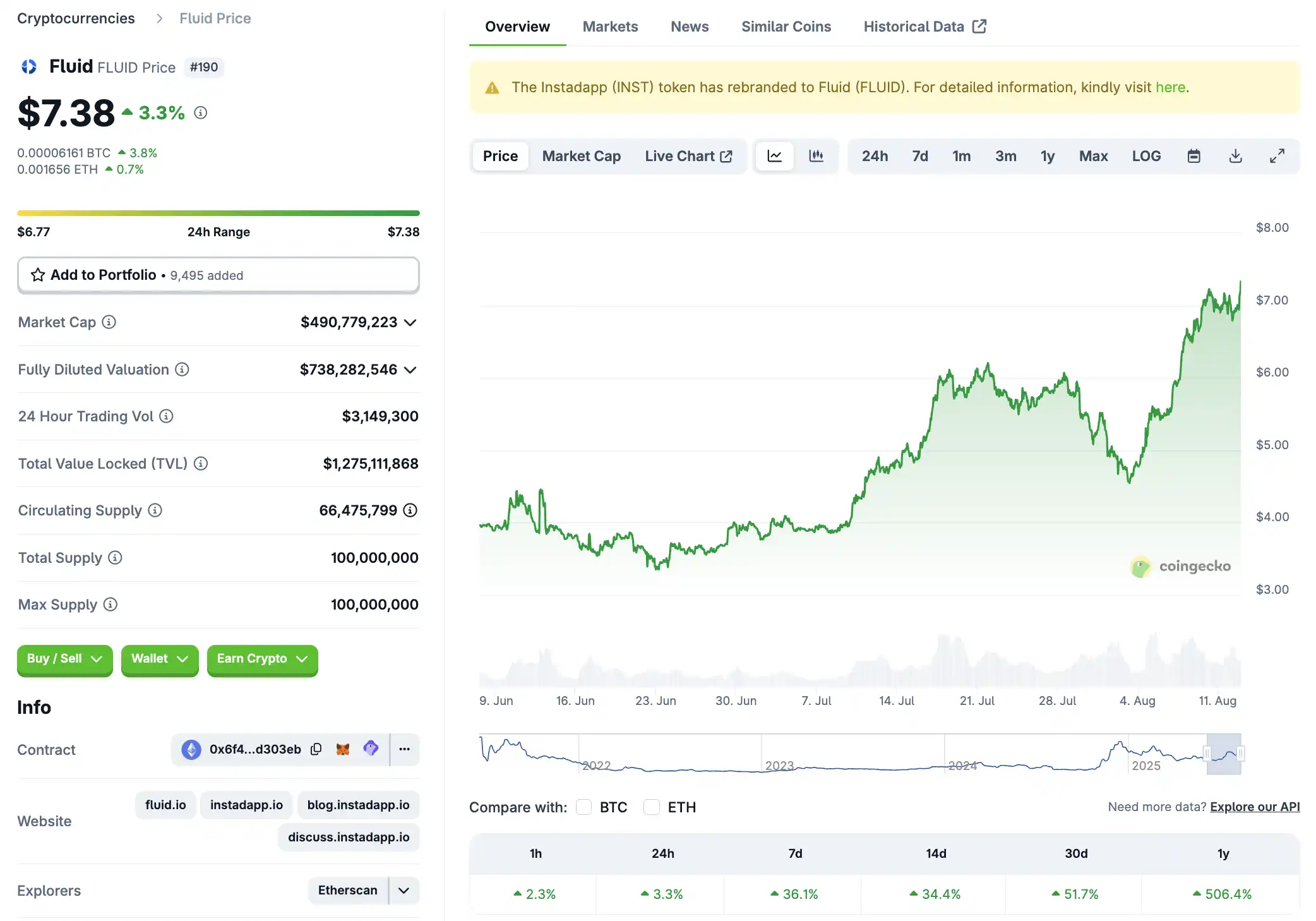 在近日的 DeFi 市场中,Fluid 成为焦点主角之一:8 月 4 日,Fluid 的日链上交易额一度超越 Uniswap,达到约 $15 亿,带动 $FLUID 价格在当日飙升 14.4%。截止目前,Fluid 已经涨至$7.38,7 天内涨幅 36.1%,30 天内涨幅 51%。