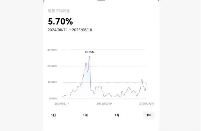 OKX APP 数据显示,从 2024 年 8 月 11 日到 2025 年 8 月 10 日,USDT 简单赚币的平均年化收益是 5.70%。这一年里收益率起伏不小,最高曾冲到 26.35%。在一些特殊行情下,年化收益甚至会在当天的某些时段飙到 50% 左右,比平时高出好几倍。