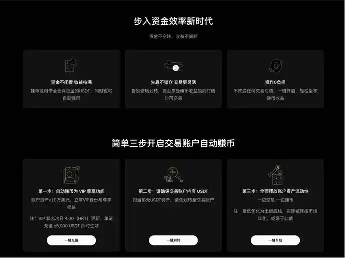 所以,无论交易型用户,还是持有型用户,交易账户里闲置的 USDT 都可自动生息。