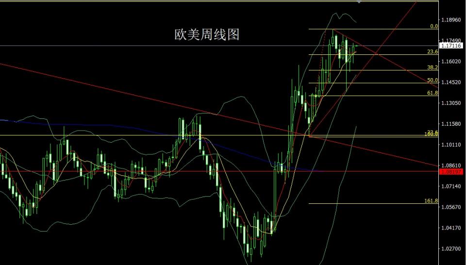 欧美市场上周小幅高开在1.16483的位置后行情先回落,周线最低给到了1.15884的位置后行情展开震荡拉升,周线最高触及到了1.17309的位置后行情强势区间震荡,周线最终收线在了1.17024的位置后行情以一根下影线很长的中阳线收线,而这样的形态收尾后,本周1.16750多止损1.16550,目标看1.17100和1.17300和1.17600-1.17800.