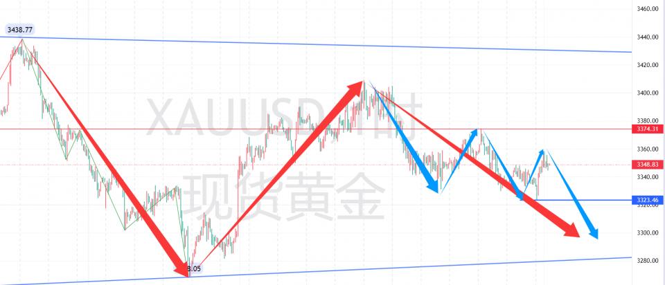 小时线级别,目前3268到3409的上行已经走完,现在需要确认的是3409到3323这波走势是否完结,因为今日开盘金价向上运行,需要关注上方3374这个位置的压制情况,若本周的延续度不够,那么就需要继续去看3409向下的延续趋势,故3374可以作为本周的一个趋势分水岭对待。短线思路,今日亚盘的反弹较为强势,欧盘关注一下3358早盘高点,以此为一个阻力位参考,若有触及或者接近可依托3360为保护去看下行,下方短期支撑关注3335位置,其次是今日的低点3323这里;故日内短线思路可等待金价反弹3355附近去布局空单看下行,首要目标看3335位置,若下跌力度强势,那么可等金价反弹3342附近继续看空金价下到3328附近。