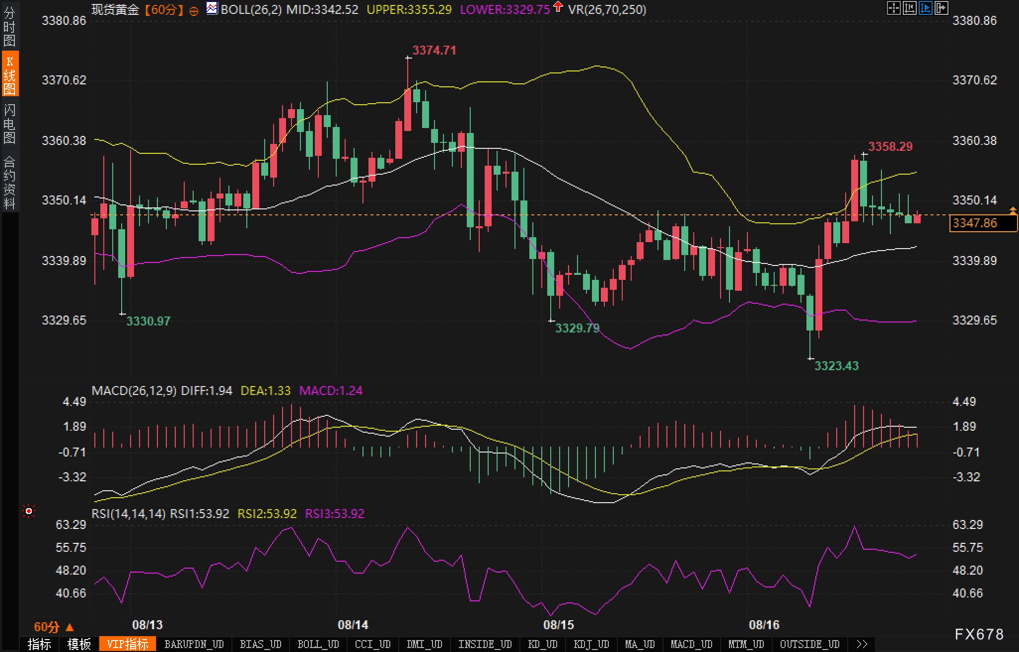 从技术图表来看,现货黄金的价格走势显示出一定的波动性,最近一段时间价格在3329.79美元至3374.71美元区间震荡。当前价格在3350附近,接近布林带中轨3342.52美元。