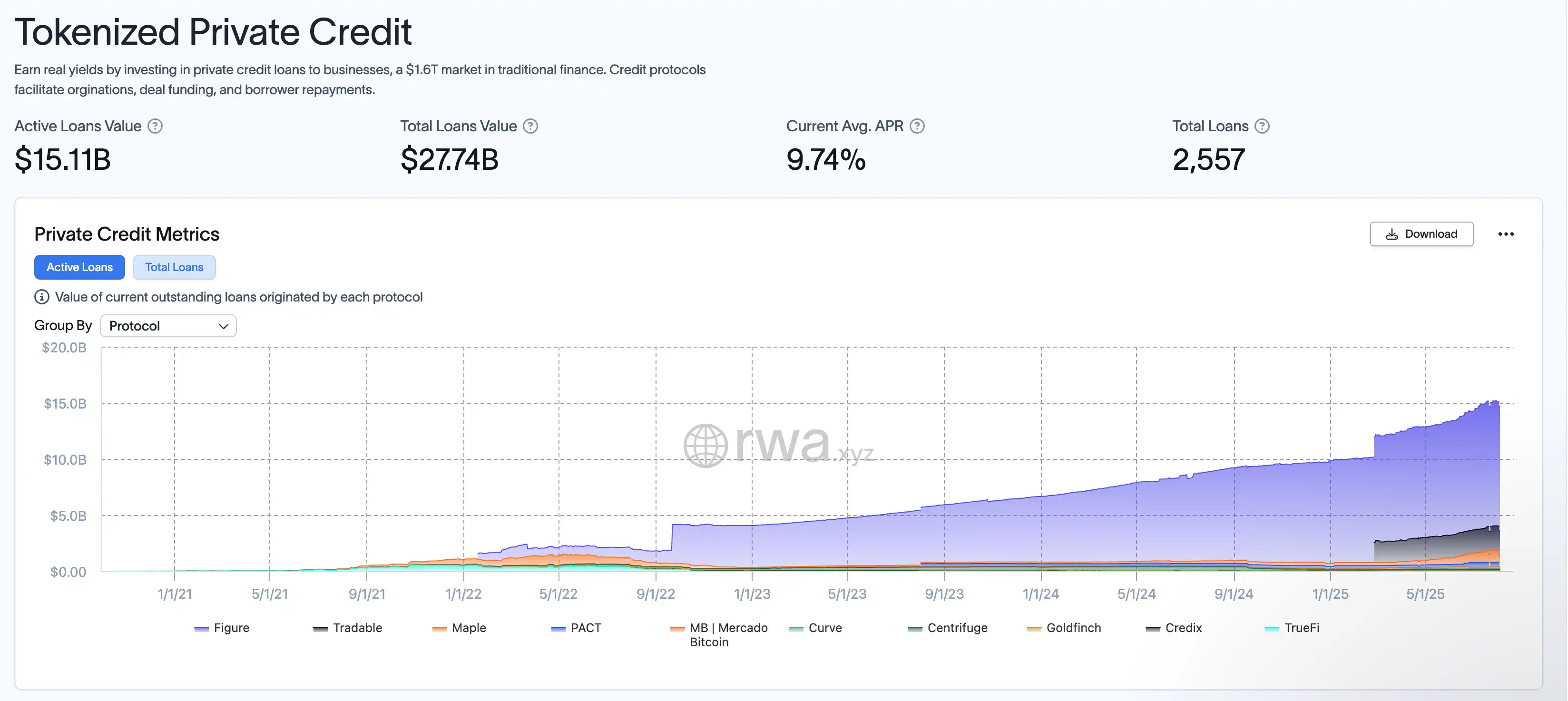 Figure 的野心远不止于房贷和加密贷款。依托 Provenance 区块链的底层技术,在总计 277.4 亿美元的代币化私人信贷市场中,Figure 累计发放贷款规模已达 130 亿美元,其中活跃贷款额高达 110 亿美元,使用率超过 84%,在 rwa.xyz 网站中可以看到,Figure 在私人信贷类别中稳居第一。无论是房贷资产还是私人信贷,Figure 都能将其数字化、可编程化,并在链上实现标准化发行与交易。这些链上资产天然兼容去中心化金融(DeFi)协议,使得原本锁在传统金融体系里的资金可以在全球范围内流通、抵押和复用,彻底模糊了 TradFi 与 DeFi 的界限。