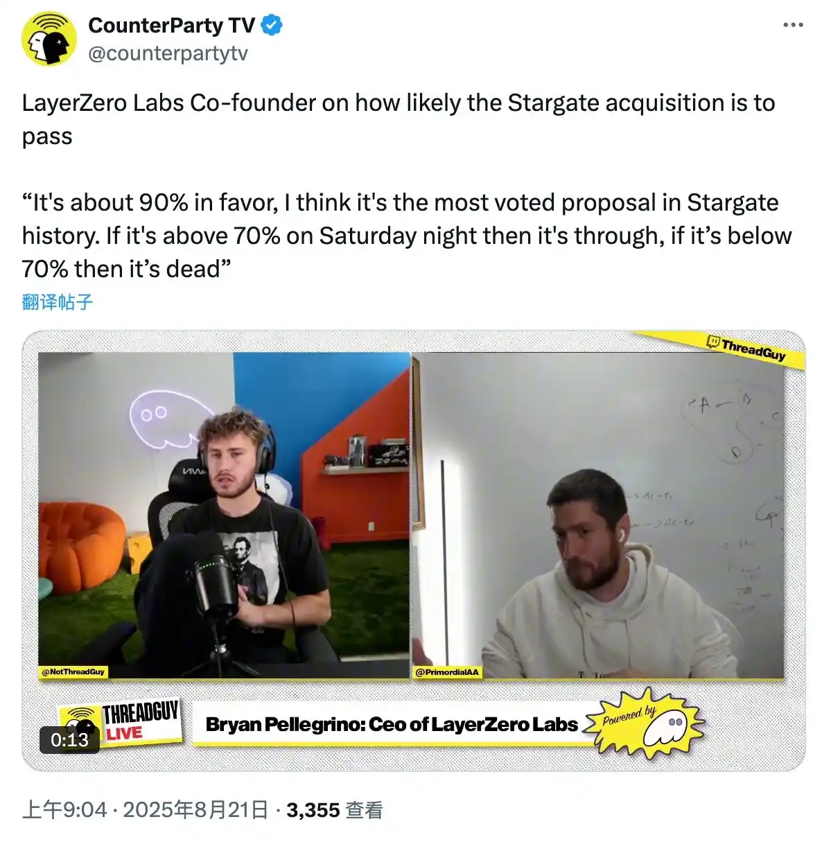 投票启动后,不但快速突破了最低票数要求,支持率更是一度上冲至 97% 以上(根据规则,结束时超过 70% 即通过)。LayerZero 联合创始人 Bryan Pellegrino 在参与 CounterParty 的播客时甚至还骄傲地大谈:「这是 Stargate 历史上参与票数最多的投票。」