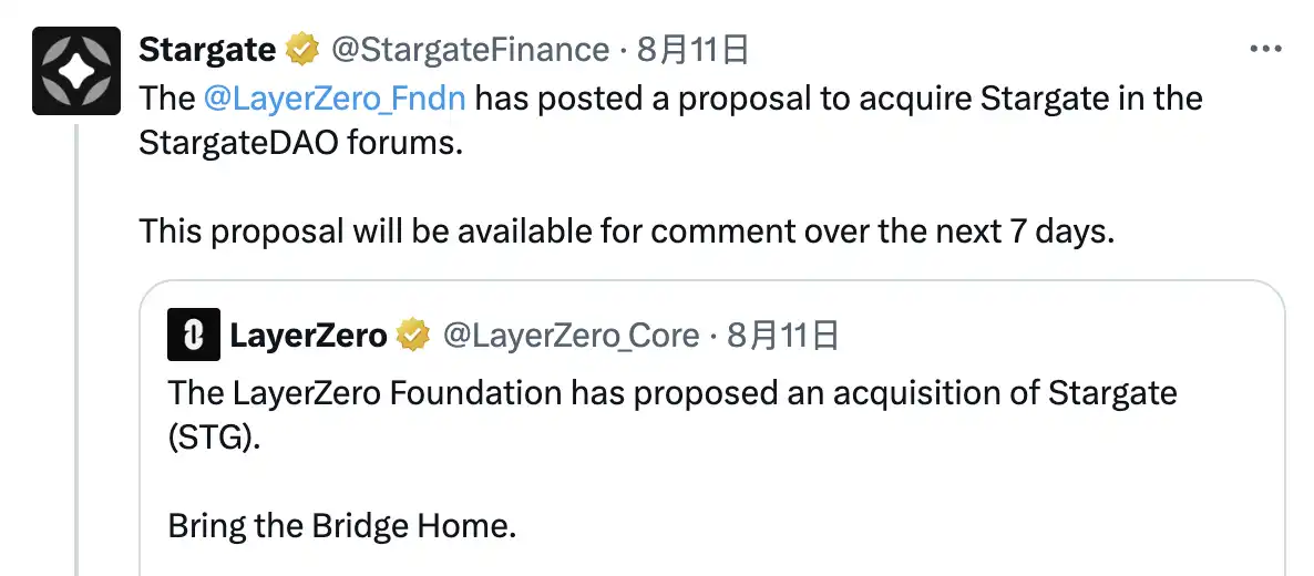 关于 LayerZero 对 Stargate 的收购提案,可追溯至 8 月 11 日——参考阅读《LayerZero 提议收购 Stargate:代币双双暴涨 20% ,但这一群体却强烈反对》。