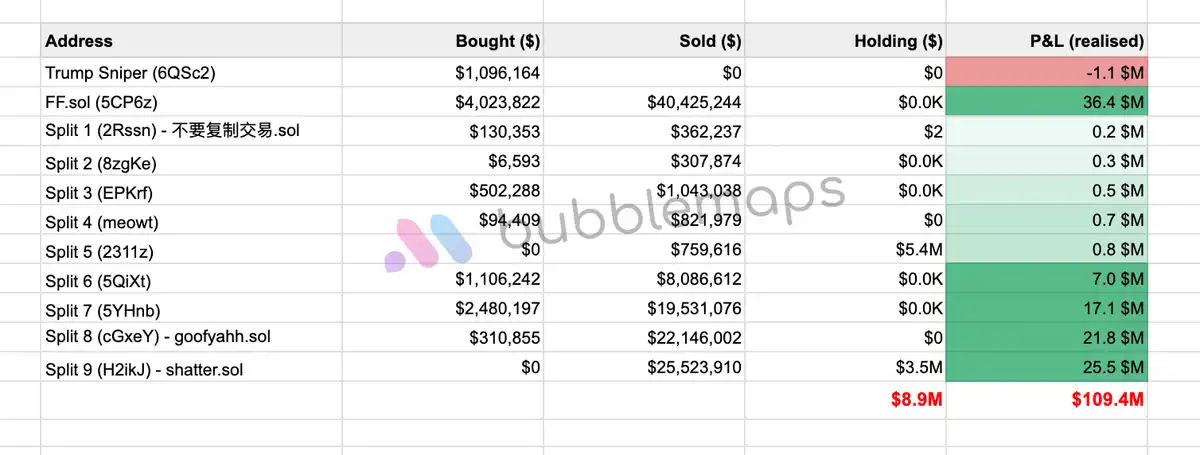 当时,Bubblemaps 发现某个 6QSc2 开头的地址在 TRUMP 上线之初便抢购了 109 万美元的代币,随后将仓位分散至多个地址,最终获利 1.09 亿美元。