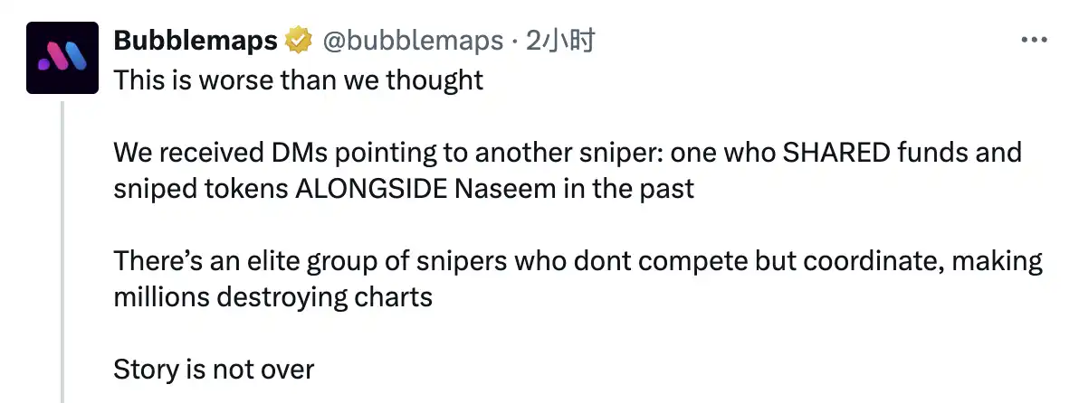 在发布了关于 Naseem 狙击 YZY 的调查情况后 5 个小时,Bubblemaps 再次发文表示:「情况可能比想象的更糟糕,我们收到了指向另一名狙击高手的私信,此人曾与 Naseem 共享资金并协同进行代币狙击——存在一个精英狙击团伙,他们并非相互竞争而是协同作案,旨在破坏币价走势并从中获利。事件仍在持续发酵中。」