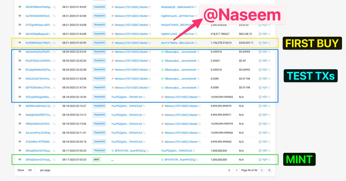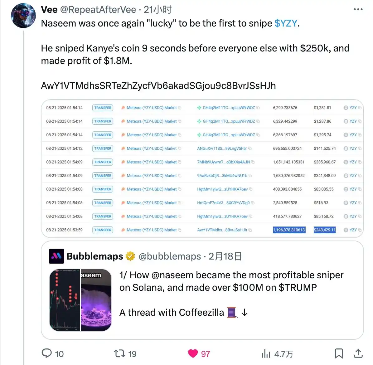 8 月 22 日早间,Bubblemaps 基于推特用户 Vee(@RepeatAfterVee)所贡献的线索披露,真正意义上首个交易 YZY 的用户极有可能是此前曾通过狙击 TRUMP 获利 1 亿美元的匿名交易员 Naseem,更令人惊异的是,除去 TRUMP、YZY 之外,Nassem 还曾通过狙击 LIBRA、HAWK 获利颇丰。