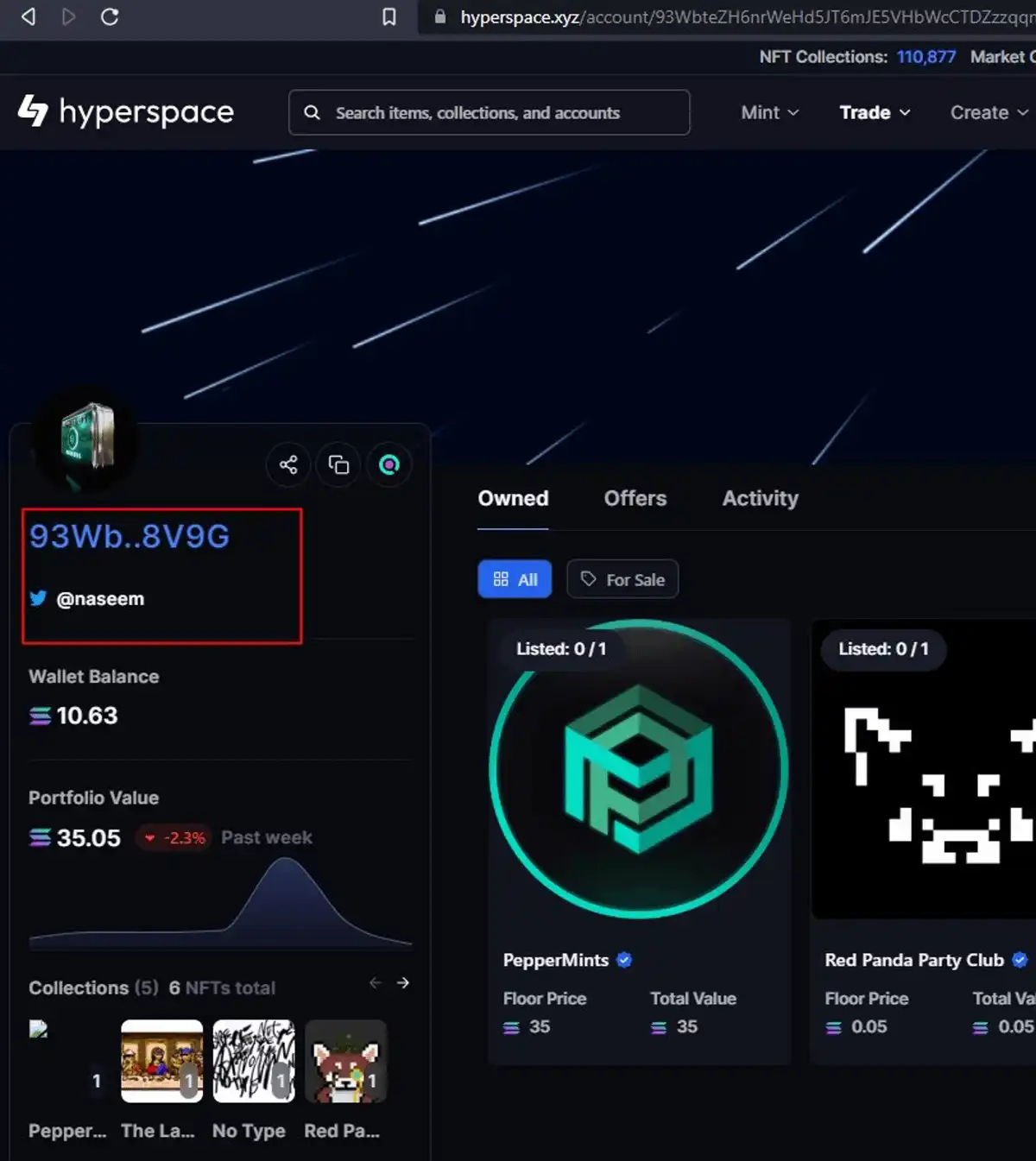 之后,Bubblemaps 又通过地址之间的资金关联发现了一个 93Wb 开头的地址,并通过 Hyperspace 将该地址定位到了推特账户 Naseem(@naseem)。