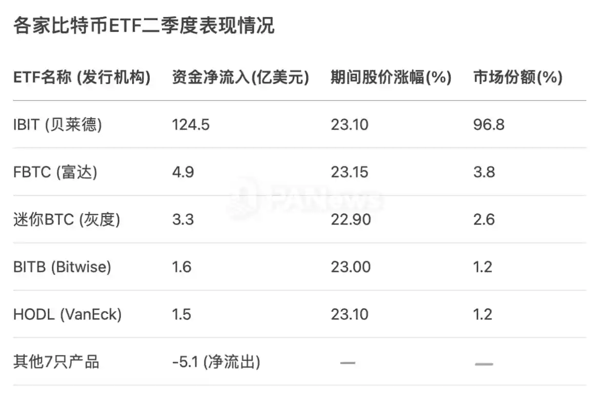 随着比特币和以太坊价格日渐攀升,华尔街正通过加密 ETF 加速掌控加密资产的定价权,成为洞察价格走势与市场情绪的重要风向标。刚收官的二季度机构财报显示,机构资金的强势入场推动加密 ETF 规模扩张的同时,也加剧了市场格局的分化,特别是贝莱德旗下产品成为新增资金的核心配置首选,而其他机构的 ETF 的表现则相对低迷。