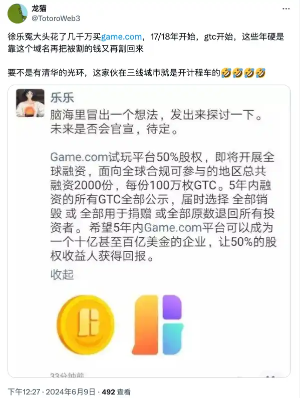 这波过山车式的暴涨暴跌背后,掀起了巨大争议。外界批评这是典型的妖币,有梗但无实质价值,质疑其本质是资本炒作,并非真实应用驱动。这一切,让徐乐从「手游出海先锋」迅速陷入争议。他被一些人称为「收割者」,但他后来回应,自己并未赚钱,甚至赔光了投入。GTC 的故事成了他的这段创业史中最具争议的一章,也让他在币圈的身份变得负面。