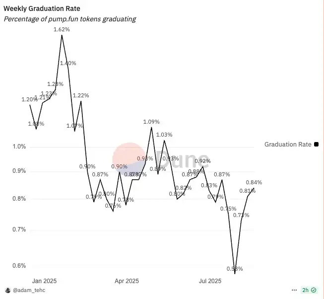 Pumpfun 毕业率下降趋势明显,与此同时代币归零的概率上升趋势明显