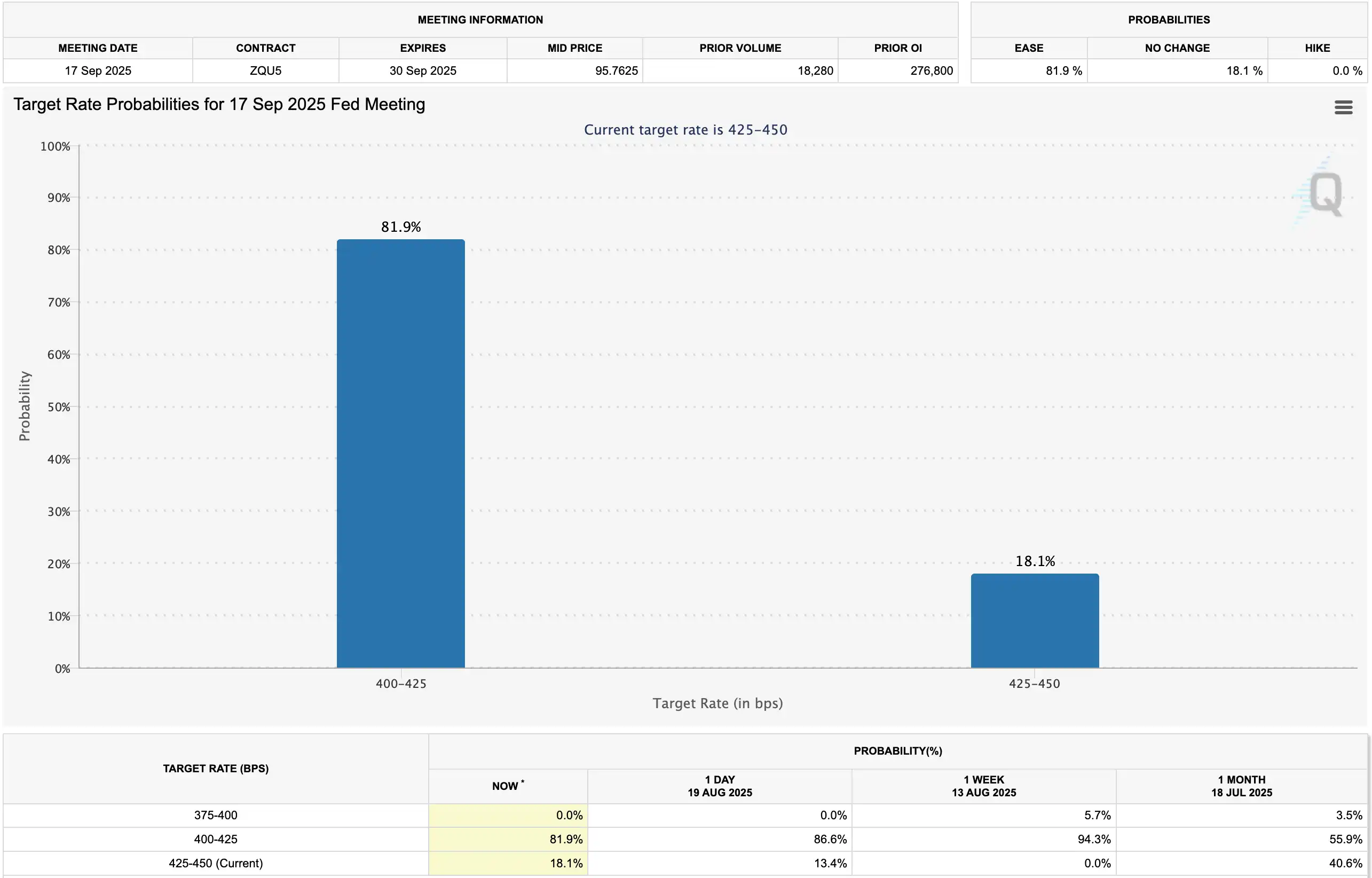 市场的焦点逐渐转向本周五,美联储主席鲍威尔将在杰克逊霍尔「全球央行年会」发表讲话。Evercore 分析师朱利安·伊曼纽尔指出,鲍威尔或将「间接释放 9 月降息 25 个基点」的信号,并且态度将保持「中立」而非一味的宽松,这种态度短期内或引发 7% 至 15% 的市场回调。最新数据显示,9 月降息 25 个基点的概率已从一周前的 94.3% 降至 81.9%,尽管仍是主流预期,但信心已有所动摇。